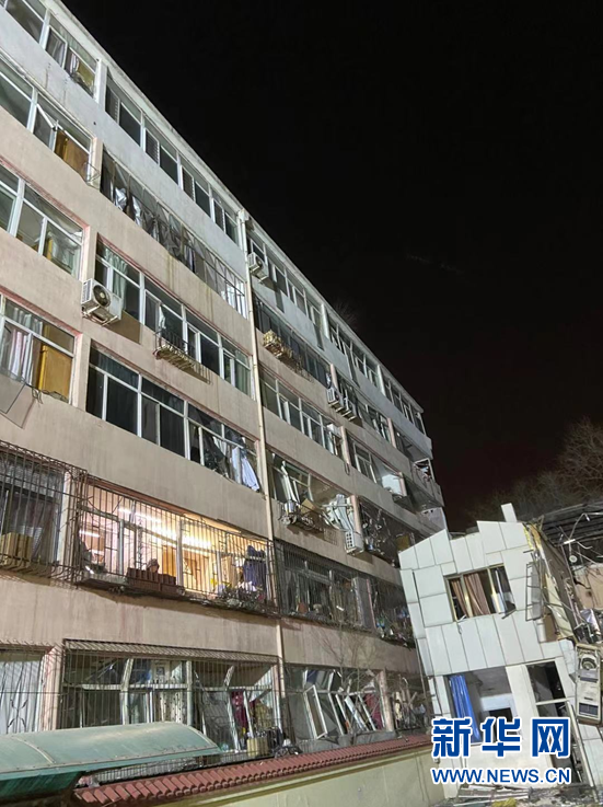 因受爆炸波及,與醫(yī)院職工餐廳臨近的一棟居民樓受損。新華網(wǎng)發(fā)(包頭市消防救援支隊供圖)
