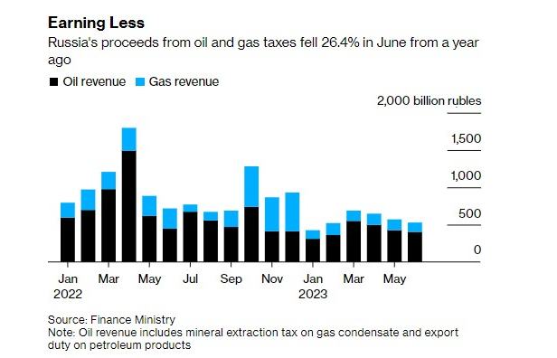 由于原油價(jià)格下跌和歐洲天然氣供應(yīng)受限,俄羅斯上月油氣收入縮水逾四分之一。俄羅斯財(cái)政部表示,6月來(lái)自石油和天然氣稅的預(yù)算收入同比下降26%,至約5290億盧布(合58.4億美元)。其中,天然氣稅的預(yù)算收入下降了54%,至1257億盧布,而原油和石油產(chǎn)品的收入(占碳?xì)浠衔锸杖氲?6%以上)下降了近十分之一,至4028億盧布。